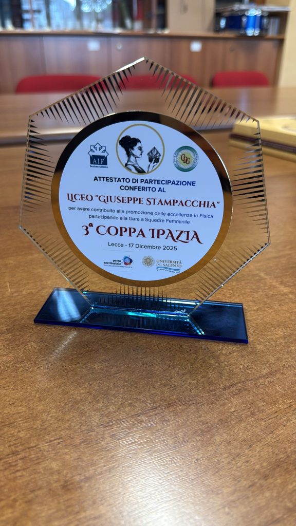 Il Liceo Scientifico “G. Stampacchia” di Tricase ha partecipato con entusiasmo e orgoglio alla Coppa Ipazia 2025, prestigiosa gara a squadre femminile di fisica, svoltasi il 17 dicembre 2025 presso il Liceo “Cosimo De Giorgi” di Lecce.