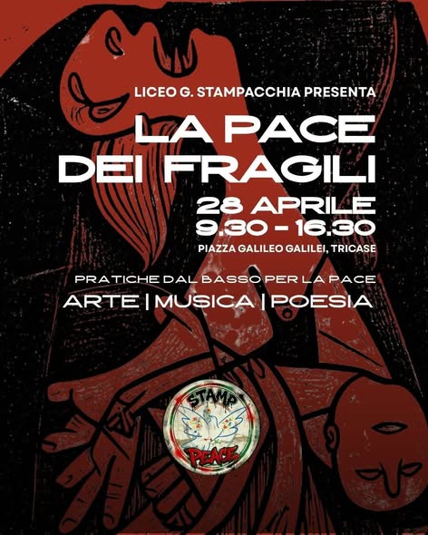 Parlare di pace a scuola oggi non è un esercizio retorico, ma una necessità. In un contesto internazionale segnato da conflitti e tensioni, docenti e studenti del Liceo Scientifico-Classico “G. Stampacchia” di Tricase hanno scelto di interrogarsi sul proprio ruolo, trasformando l’incertezza in occasione di riflessione e partecipazione. Da questa esigenza, e dalla ricerca di senso nell’abitare una realtà contemporanea spesso difficile da comprendere, è nato un percorso coordinato dalla prof.ssa Elena Turco, con al centro la riflessione sulla situazione della popolazione palestinese e sulle violazioni dei diritti fondamentali. Dalle tante attività realizzate, fra cui un cineforum e vari laboratori espressivi è emersa con chiarezza una consapevolezza: arte, cultura e musica sono, così come accade nei territori occupati, forme di resistenza non violenta e di difesa dell’identità. Per questo motivo, tutto il lavoro culminerà nell’ultima assemblea di istituto dell’anno, il giorno 28 APRILE dalle 9.30 alle 16.30, in piazza Galileo Galilei, spazio antistante la sede centrale dell’Istituto. Pubblichiamo il programma della giornata. Venite a trovarci!!!